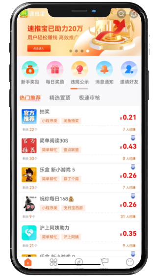 软件注册下载,小程序推广,游戏试玩,动动手指的小任务即可赚取大报酬。新手注册送红包,赶紧加入“速推宝”