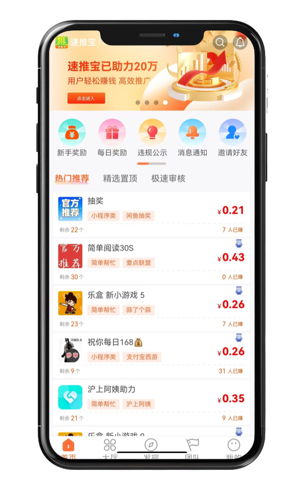 悬赏任务单价高,轻松赚大钱,动动手指就能赚钱的好软件,邀请您的好友注册速推宝,最高永久享8%提成奖励+10元邀请奖。赶紧邀请加入速推宝